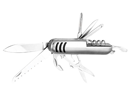 Cortaplumas de Acero Inoxidable con 10 funciones. Incluye funda de tela negra + caja de regalo plateada.